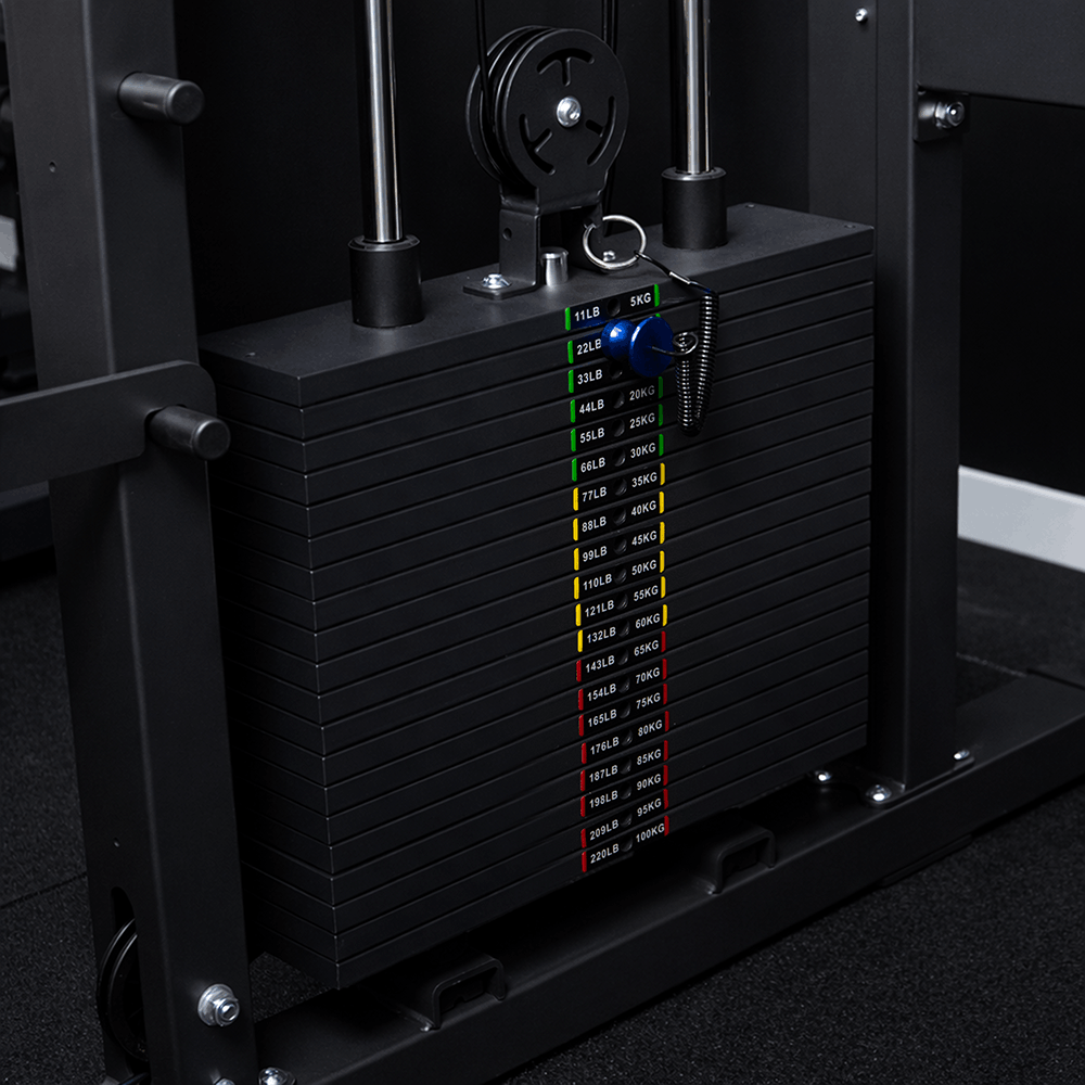 - Accesorios incluidos: Barra Smith 220 cm (15 kg), spotters delanteros, cuerda de tríceps, Pull Bar dorsal, manerales en D, accesorio Landmine para barra T, asas de inmersión, barra de empuje, juego de cadenas 8 Link Chain Set y soporte de espuma.