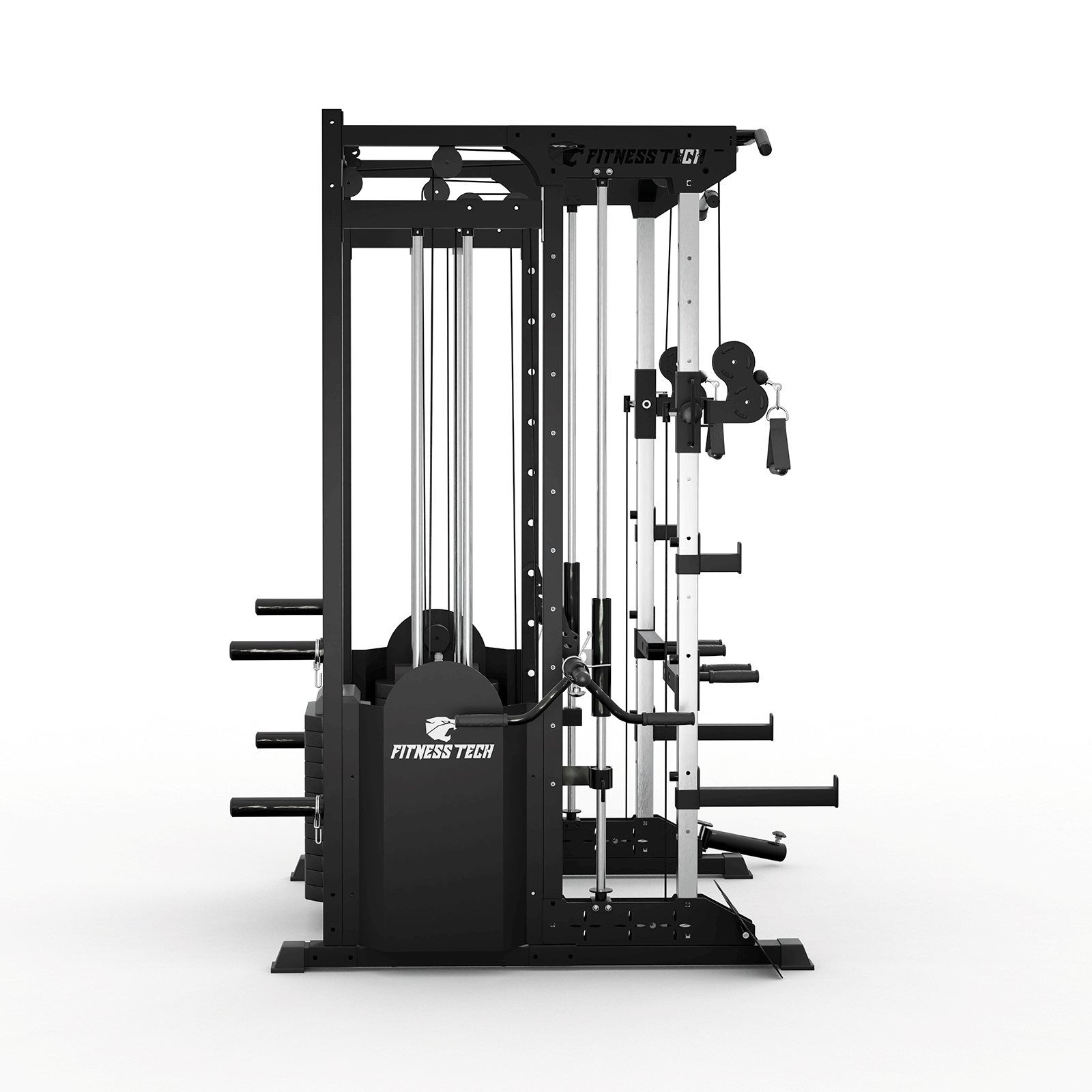 La Smith Machine S9000 es una estación de entrenamiento avanzada diseñada para quienes buscan montar un gimnasio completo y potente en casa. Combina barra Smith guiada, poleas laterales y una polea central independiente para ofrecer una experiencia de musculación fluida, estable y versátil. Su estructura en acero reforzado y su sistema de carga integrado permiten realizar entrenamientos variados, cómodos y seguros dentro de un único equipo compacto.